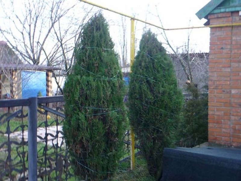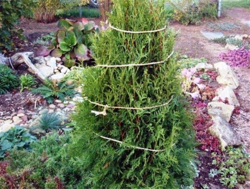 - Можно просто обвязать тую по кругу бечевкой (лучше пройти сначала внизу вверх, а потом сверху вниз), пригнув боковые ветки к основному стволу.
