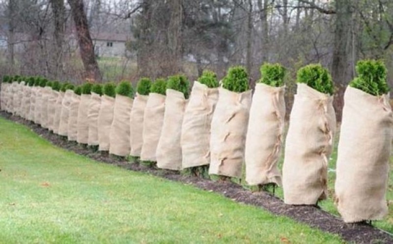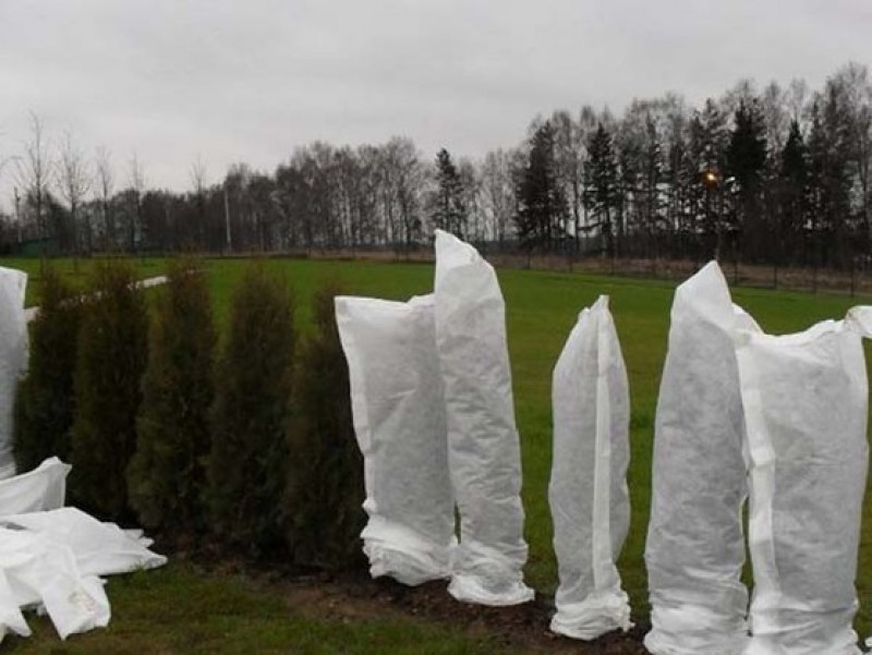 - Для защиты туи от солнца можно использовать марлю, крафт бумагу, хлопчатобумажную ткань белого цвета (простыню, пододеяльник), полипропиленовые мешки, мешковину, полимерную сетку.