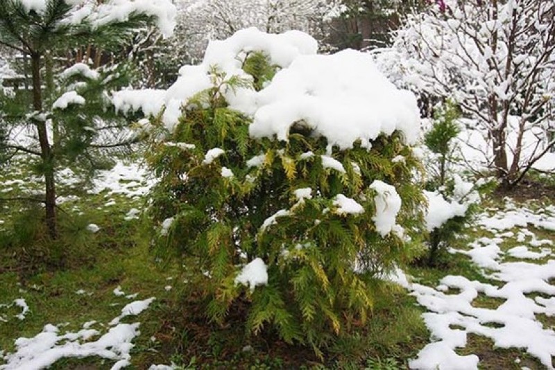 Молодые туи (от года до 4-5 лет) достаточно нежные, из-за чего они могут деформироваться под снежным покровом. Когда снег налипает на ветки, то они сильно гнутся и могут попросту сломаться под тяжестью снежных масс.