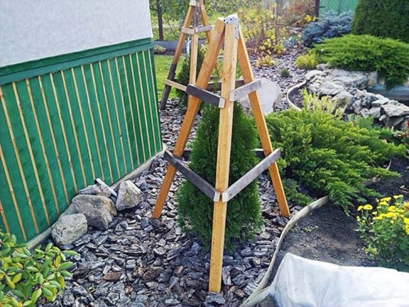 - 1. Сделать каркас. Например, вбить 3 металлических или деревянных штыря, чтобы они все пересекались «крест накрест» над макушкой хвойника, и закрепить их.
